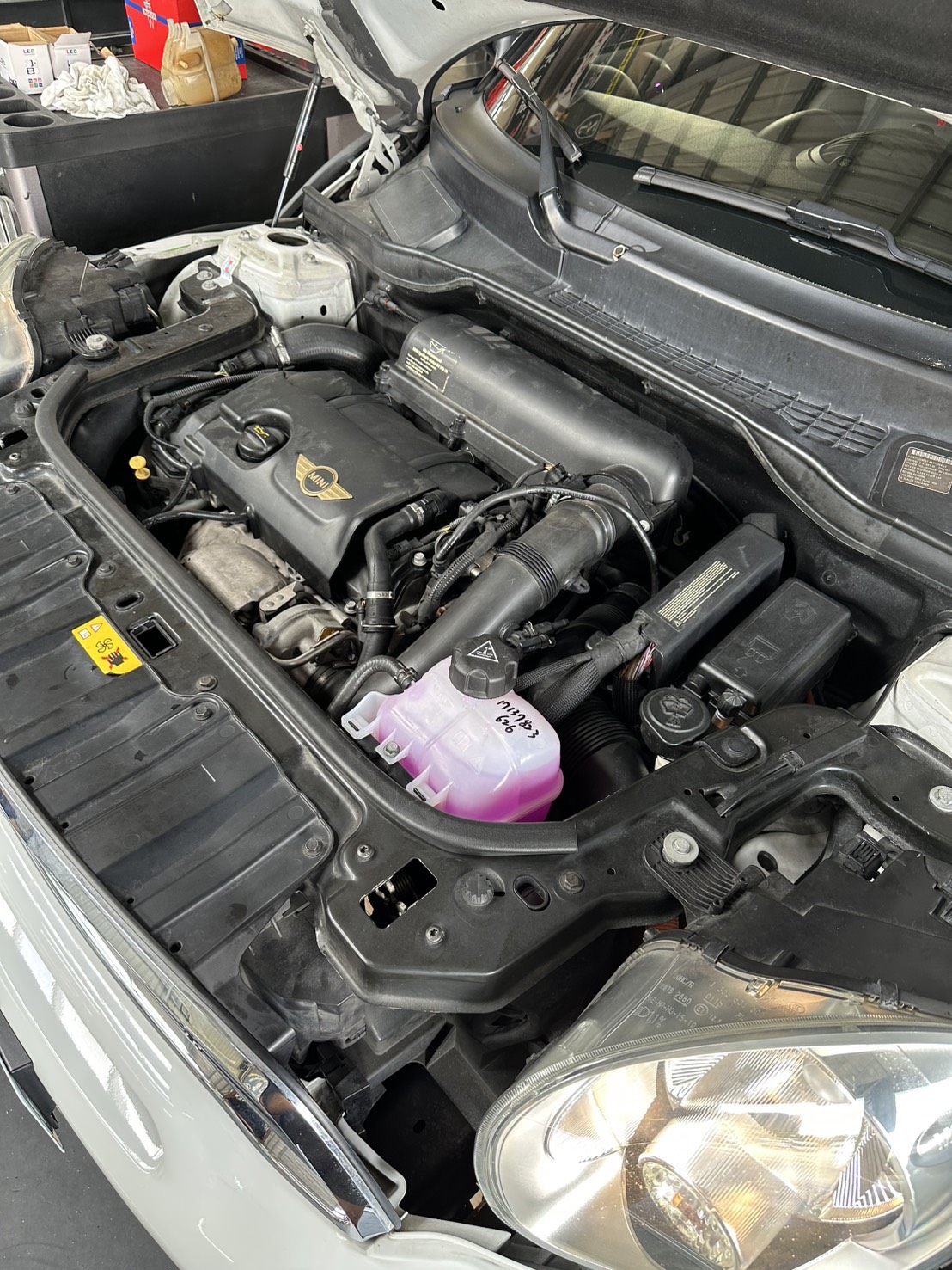 - 選用MINI原廠粉色冷卻液,以怠速+暖風最大檔迴圈排氣;