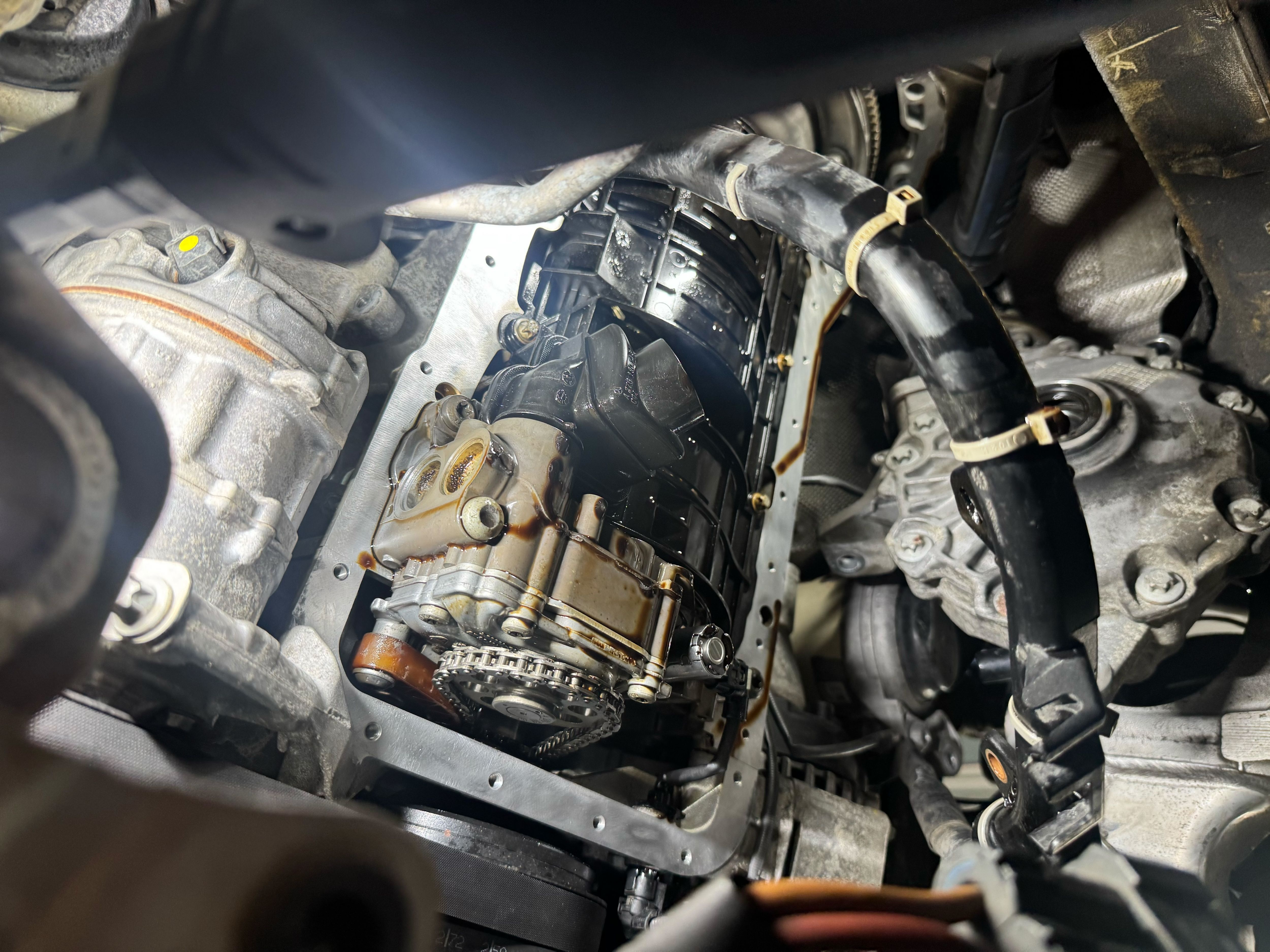 圖:油底殼拆卸完成,直觀看見機油幫浦安裝位置、正時鏈條與內部油路結構