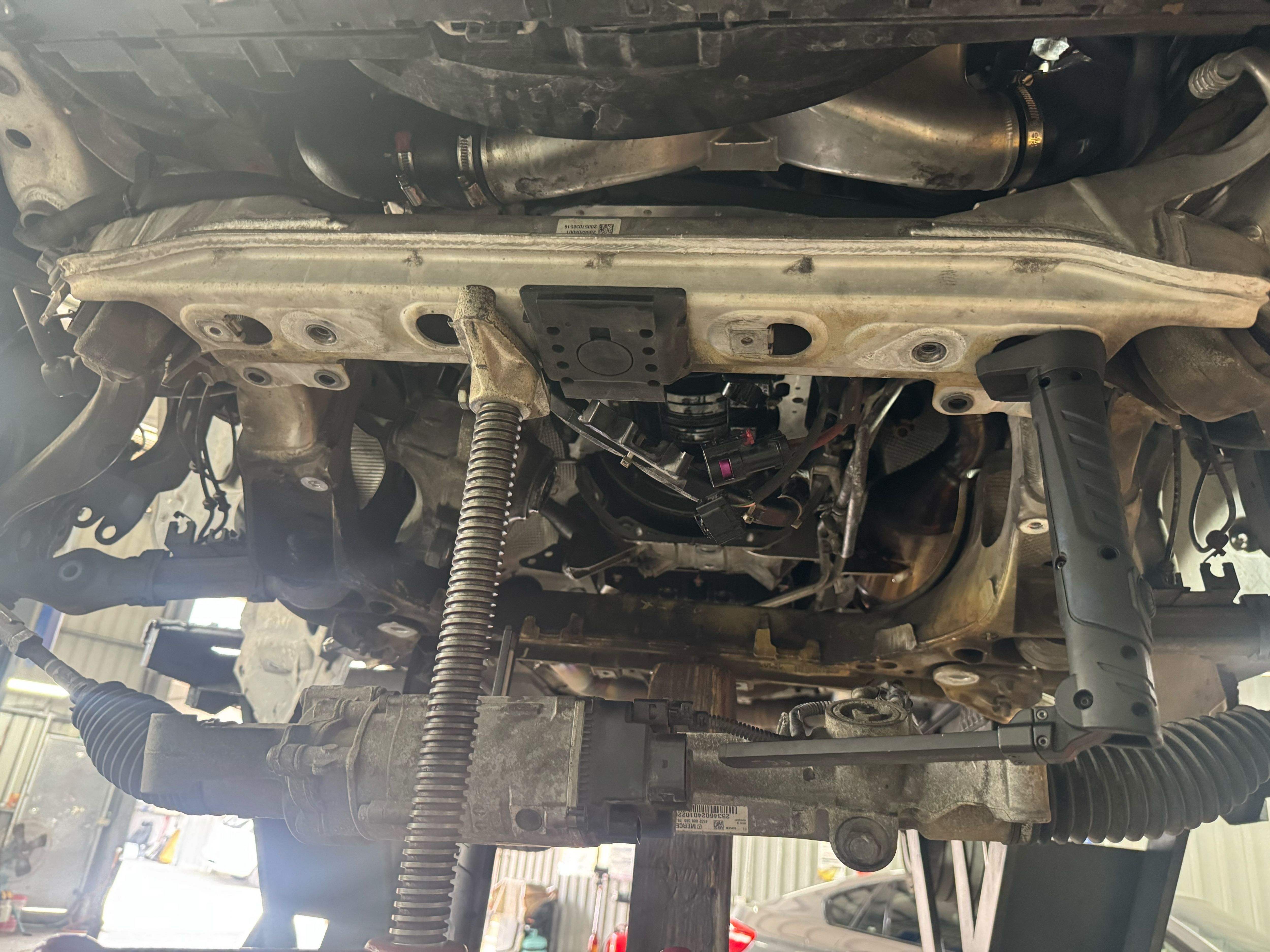 為取得機油幫浦與電磁閥維修空間,需將車輛穩固頂升,拆解除前橋副車架、方向機總成等周邊機構,才能順利拆下油底殼。