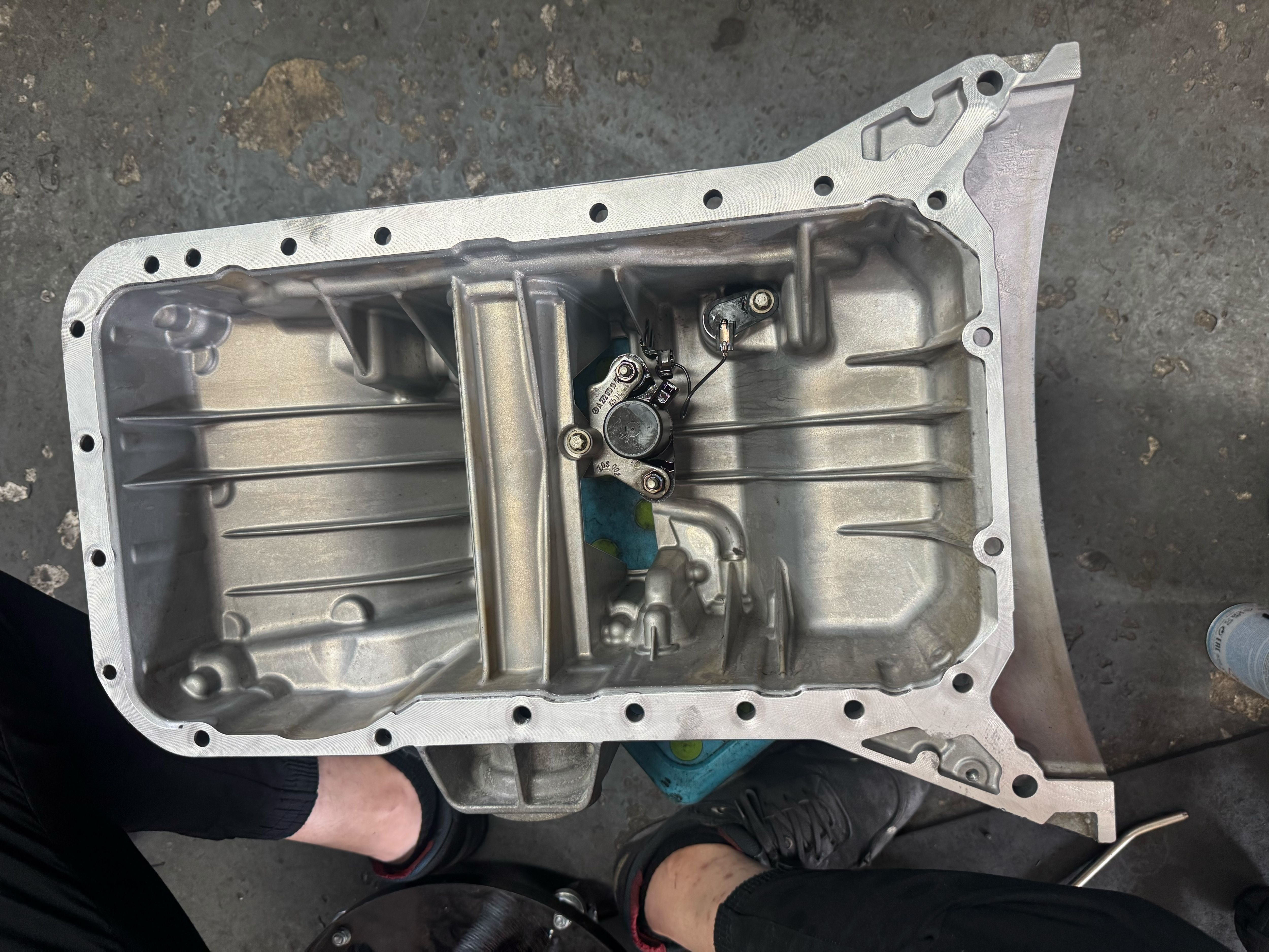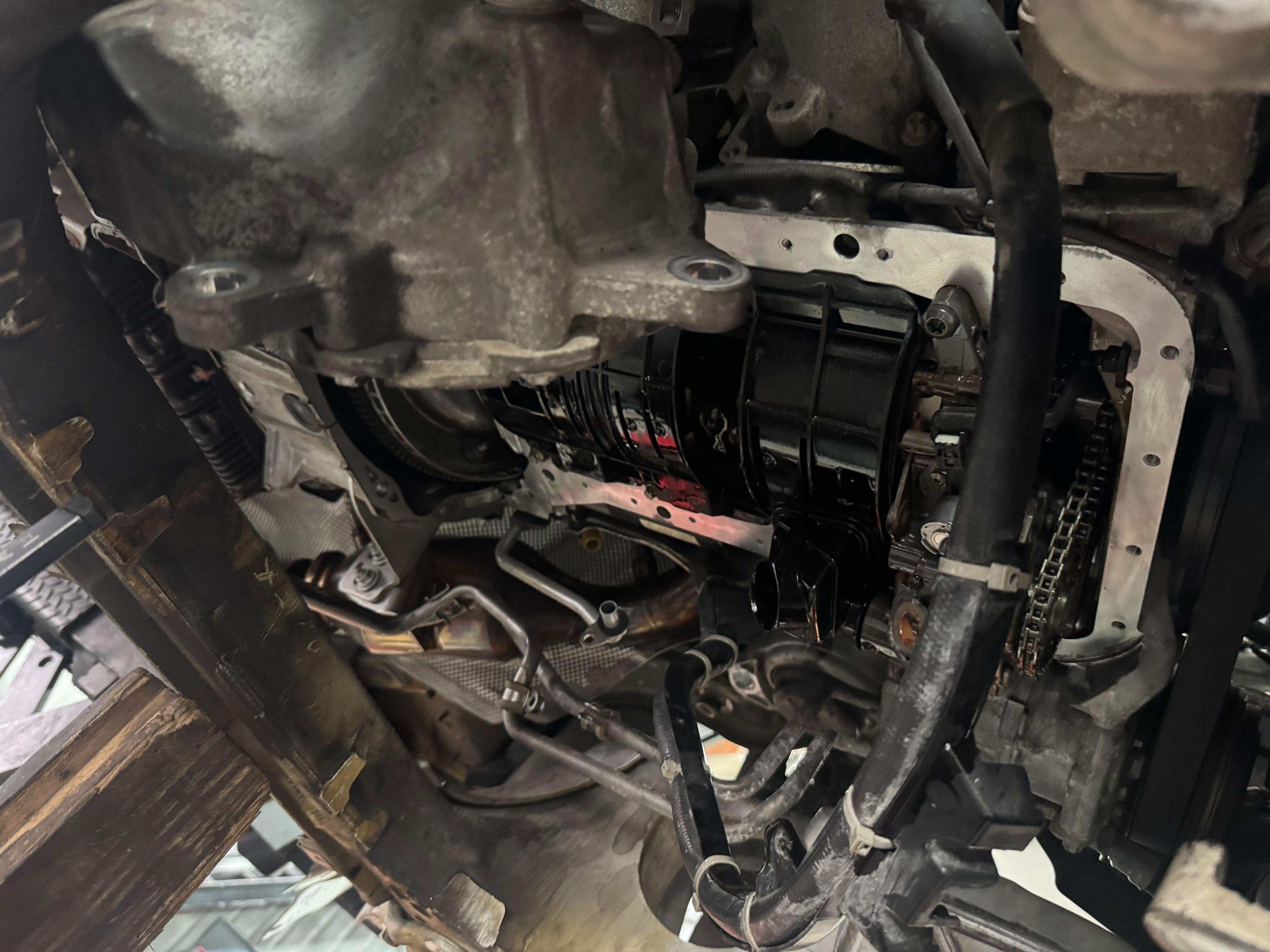 逐步拆卸油底殼固定螺絲,分離密封介面,取下油底殼本體,露出引擎底部內部機構、機油集濾器、正時鏈條與機油幫浦本體。